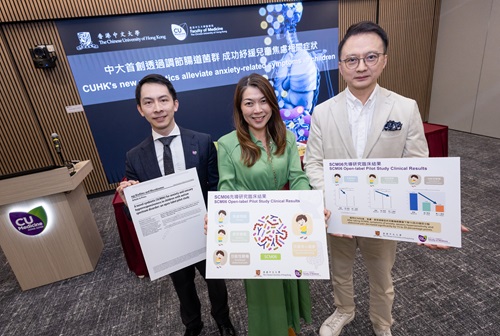 中大醫學院跨學科團隊針對兒童面對焦慮情緒和感官過敏的困擾,成功研發SCM06配方。這些菌株在實驗室研究中已證實能促進產生具穩定神經作用的物質,有望透過腸腦之間的聯繫(腸腦軸)緩解情緒症狀。研究團隊於2023至2024年間開展一項臨床研究,邀請了30名4至11歲有明顯焦慮及感官過敏症狀的自閉症兒童參與,為他們提供為期12星期的SCM06口服配方。參加者每日服用配方,並定期接受臨床評估及糞便樣本分析,以觀察臨床症狀、腸道菌群及其代謝物的變化。
